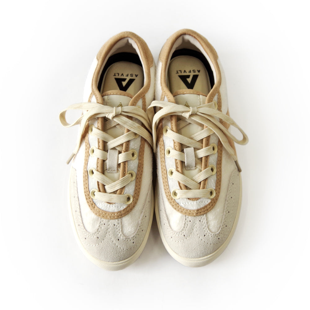 滑らかなハラコ調素材をベースにナチュラルなベージュ×グレースエードの組み合わせが優しいニュアンスのカラー。